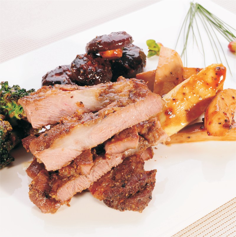 2梅花肉用鹽、雜蔬菜汁、黑椒碎腌。再加少許橄欖油、鮮百里香腌10小時。